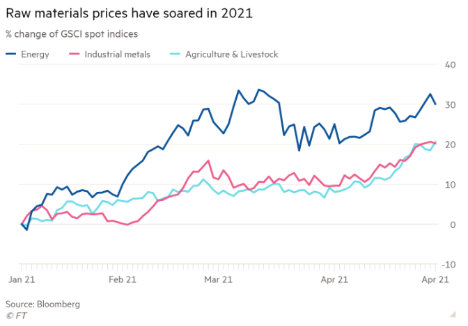 The energy sector has particularly impressed in 2021, even compared to industrial metals which bounced back from a decade-long slumber. Commodity markets are typically cyclical—they bend to the economy’s tune—and thus, during a time of economic recovery, they become interesting assets to study. The next graph shows raw input prices, where energy commodities beat the rest.