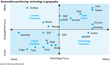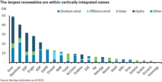 Le plus grand pure-play renouvelable est EDPR avec près de 14GW d'éoliennes terrestres. D'autres pure players, dont Neoen, Scatec, Solaria et Grenergy, sont par nature plus petits, mais exclusivement axés sur les énergies renouvelables.