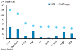 Il y a trois groupes d'acteurs clés : les services publics intégrés verticalement, les majors pétrolières et les pure-plays. La figure suivante résume la capacité installée et celle en cours de construction des producteurs européens d'énergie renouvelable à la fin de 2021.