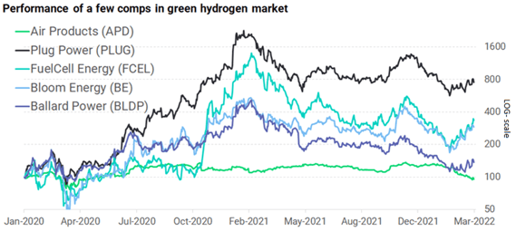 Pour un secteur qui s'est largement concentré sur l'énergie solaire et éolienne, les technologies alternatives devraient commencer à prendre une part plus importante du gâteau énergétique. L'hydrogène vert, un combustible universel, léger et très réactif, en est un exemple. L'hydrogène vert est un hydrogène produit exclusivement à partir d'énergie renouvelable par un processus chimique appelé électrolyse. Le principal avantage de l'hydrogène vert est qu'il peut servir de stockage saisonnier de carburant disponible à la demande pour produire de l'énergie. L'hydrogène comme carburant est une réalité dans de nombreux pays développés, et certains, comme le Japon, vont encore plus loin et aspirent à devenir une économie de l'hydrogène. La taille du marché mondial de l'hydrogène vert est évaluée à 1,8 milliard USD en 2021 et devrait atteindre 90 milliards USD d'ici 2030, soit un taux de croissance annuel moyen de près de 53 % de 2021 à 2030.