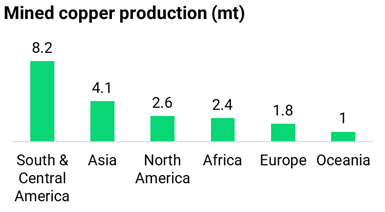 Le cuivre est aujourd'hui le meilleur métal non précieux conducteur d'électricité et entre dans la fabrication de composants électroniques et électriques. À ce jour, environ 700 millions de tonnes métriques de cuivre ont été extraites dans le monde. On estime que 2,1 milliards de tonnes de gisements identifiés restent dans le sol, tandis que les gisements non découverts sont estimés à 3,5 milliards de tonnes. Le Chili et le Pérou sont les principaux exportateurs de minerai de cuivre, tandis que la Chine et le Japon sont les principaux acheteurs..