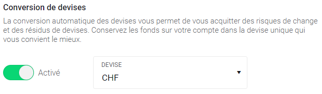En activant cette fonction, la conversion de devises sera effectuée automatiquement en fonction des taux actuels du marché. Veuillez noter que cette fonction sera appliquée pour les transactions futures, mais qu'elle ne convertira pas votre solde négatif déjà existant.